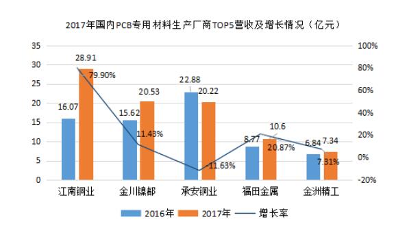 國內PCB專用化學品龍頭生產企業為廣東光華科技股份有限公司,以“高性能電子化學品”、“高品質化學試劑”和“新能源材料”為主導深耕于PCB領域;2017年營收為12.99億元,占比高達30.95%,其中PCB化學品占營收比重超過50%,為58.97%。