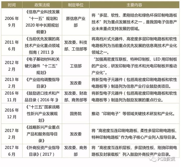 鑒于PCB在電子信息產(chǎn)業(yè)中的重要地位,近年來我國政府和行業(yè)主管部門推出了一系列相關(guān)產(chǎn)業(yè)政策和法律法規(guī),具體如下: