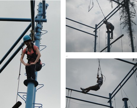 工程部 張維霞——空中抓桿讓人既緊張又愉悅,緊張的是當(dāng)我從地面爬上了一個(gè)高8米的柱子的時(shí)候,不知為什么好像這個(gè)柱子都在抖,腳好像不受控制一樣,不停的發(fā)抖,連聲音也會(huì)變的顫抖起來,當(dāng)眼睛往地面看去時(shí)候更加發(fā)抖了,雖然有保險(xiǎn)繩保護(hù)還是腦子空白一片,當(dāng)時(shí)真的是很害怕,想放棄了,但是聽到下面的同事在給我加油鼓勵(lì)的時(shí)候,我在想我不能給我們這個(gè)團(tuán)隊(duì)拖后腿,于是我先深呼吸盡量不往下面看,用眼睛注視著前面一個(gè)距離我們1米5遠(yuǎn)的單杠.拋去雜念想著一定要抓住單杠,我叫地面拉保險(xiǎn)繩的伙伴放松繩子,把腳慢慢移出柱子,雙膝下蹲,伸出雙手像僵尸一樣,縱身往前一跳,我抓住了單杠,我成功了。愉悅的是當(dāng)克服心中的恐懼,義無返顧地騰空躍起牢牢抓住1米5遠(yuǎn)處桿子的那份成就感。