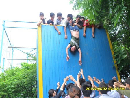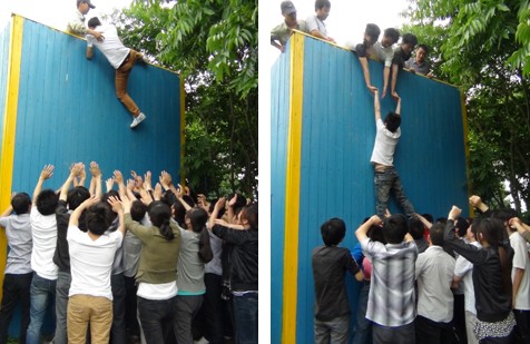 工程部 張維霞——在4米高的畢業(yè)墻面前,二個(gè)小團(tuán)隊(duì)合并成一個(gè)大團(tuán)隊(duì),競爭沒有了,只剩下合作。經(jīng)過討論,我們找到了爬畢業(yè)墻的方法:高個(gè)隊(duì)員站在魁梧高大的墊底隊(duì)員肩上,再由第二輪隊(duì)員托舉高個(gè)隊(duì)員的腳,使其可以伸手夠到墻頂,努力爬到墻上,再把下一位隊(duì)員拉上來,其余隊(duì)員圍在墻下,雙臂彎曲呈托舉狀,作保護(hù)人墻,隊(duì)員都爬過墻了,最后一個(gè)隊(duì)員是上面的一個(gè)隊(duì)員倒立用手拉住最后一個(gè)隊(duì)員然后被墻上的隊(duì)員拉上來了。31個(gè)隊(duì)員以11分40秒的好成績成功了。我們這些中間爬上墻頂?shù)年?duì)員們,看著墊底隊(duì)員因被踩而紅紅的肩膀,衷心感謝他們的付出和犧牲;看著先驅(qū)隊(duì)員因拉人而酸痛的胳膊,感謝他們的勇氣和力量;互相感謝著,為了給予別人的支持,為了團(tuán)隊(duì)合作的成功,為了相互的信任,為了超越了的自己。